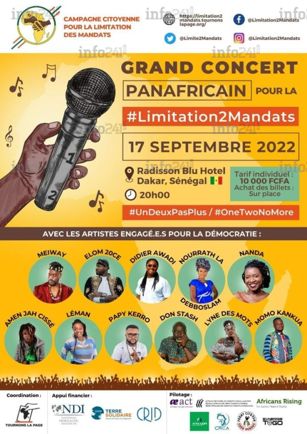 Dans un arrêté publié vendredi soir, le préfet de Dakar, Mor Talla Tine, a interdit l’organisation du concert panafricain pour la limitation à deux des mandats présidentiels en Afrique, qui devait se tenir samedi dans un hôtel de Dakar. Initié par des organisations de la société civile dans le cadre d’une campagne citoyenne de sensibilisation pour la limitation des mandats présidentiels, le spectacle devait enregistrer la présence de onze artistes africains en provenance de sept pays.