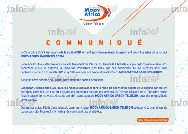Le 12 octobre 2023, des agents de la société ISP, ont entrepris de manifester bruyamment devant le siège de la société MOOV AFRICA GABON TELECOM.