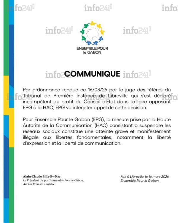 Loin de s’avouer vaincu par cette fin de non-recevoir procédurale, le camp d’Alain-Claude Bilie-By-Nze a immédiatement réagi. Le jour même du délibéré, le bureau du parti a publié un communiqué officiel pour contester cette interprétation juridique et annoncer la suite de sa stratégie. « Par ordonnance rendue ce 16/03/26 par le juge des référés du Tribunal de Première Instance de Libreville qui s’est déclaré incompétent au profit du Conseil d’Etat dans l’affaire opposant EPG à la HAC, EPG va interjeter appel de cette décision », indique sobrement la communication du mouvement.