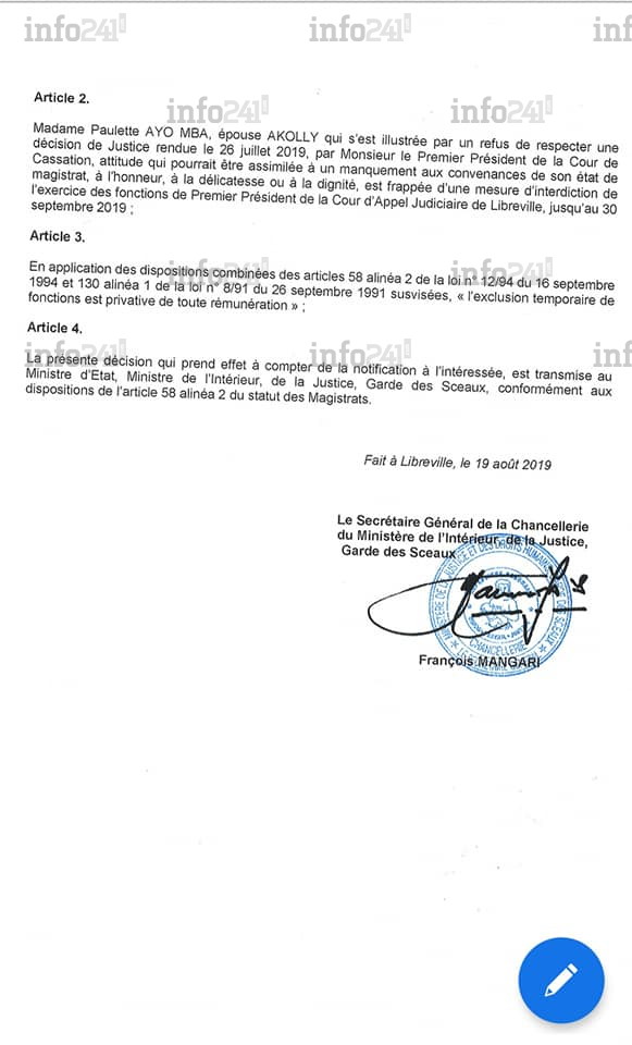 Pour le ministère de la Justice à l’origine de cette décision, la juge «  s’est illustrée par un refus de respecter une décision de justice rendue le 26 juillet 2019 par monsieur le président de la Cour de cassation  ». Une faute qui vaut à l’intéressée une exclusion temporaire de plus de 40 jours des effectifs de la justice gabonaise avec pour conséquence, le non-paiement de son salaire de septembre prochain.