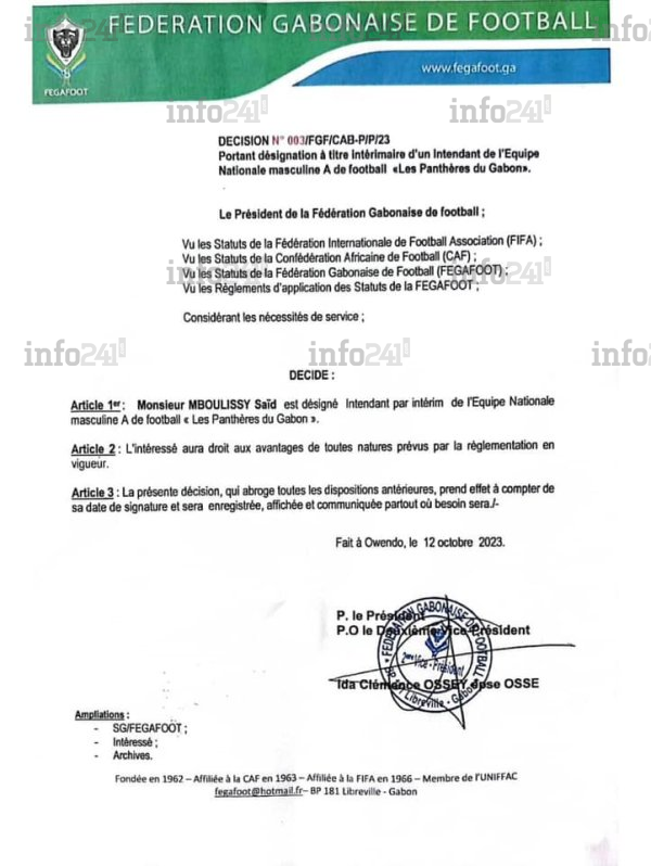 En effet, selon une décision rendue publique ce vendredi par la Fegafoot sur sa page Facebook, Serge Ahmed Mombo a été démis de ses fonctions au sein du staff de la sélection gabonaise de football la veille, ce 12 octobre. Il a été remplacé à ce poste par Saïd Mboulissy. Un limogeage qui interroge quand à sa rapidité. Ce, alors que les Panthères sont actuellement en regroupement à Lisbonne (Portugal).