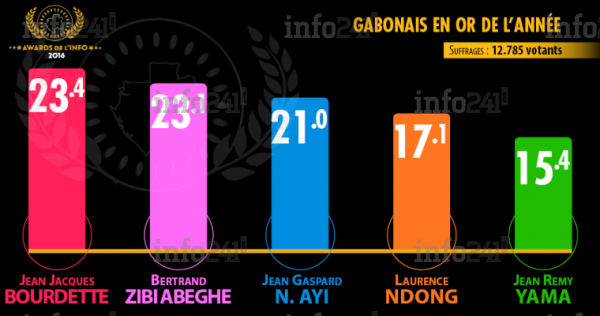 Le prix du Gabonais en or faisait parti des innovations enregistrées lors de cette deuxième édition des Awards de l’info. Jean Jacques Bourdette a été sacré par le vote des internautes gabonais, prix du Gabonais en or de l’année 2016 avec 23.40 % des suffrages exprimés. Le lauréat a été préféré à 4 autres personnalités que sont : Bertrand Zibi Abeghe, 23.10 %, Jean Gaspard Ntoutoume Ayi, 21 %, Laurence Ndong, 17.10 % et de Jean Remi Yama, 15.40 %.