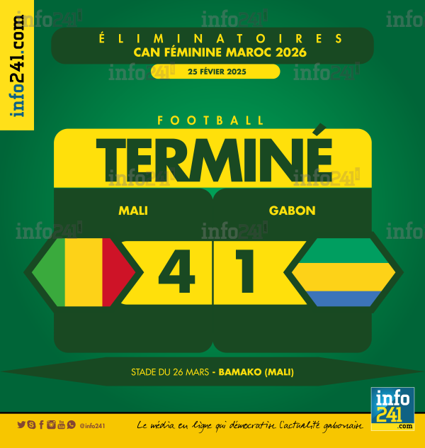 Malgré une meilleure entame de match, les Panthères ont vite cédé sous la pression des Aigles. Agueissa Diarra a ouvert le score sur penalty à la 22e minute, avant que Salimata Diarra (35e) et Coulouba Sogoré (43e) ne viennent corser l’addition avant la pause. De retour des vestiaires, les Gabonaises ont tenté de réagir et ont été récompensées par un penalty transformé par Laschwana Gray Assengone Mvie (80e). Mais l’embellie a été de courte durée, puisque Aïssata Tapily (82e) a scellé définitivement la qualification des Maliennes.