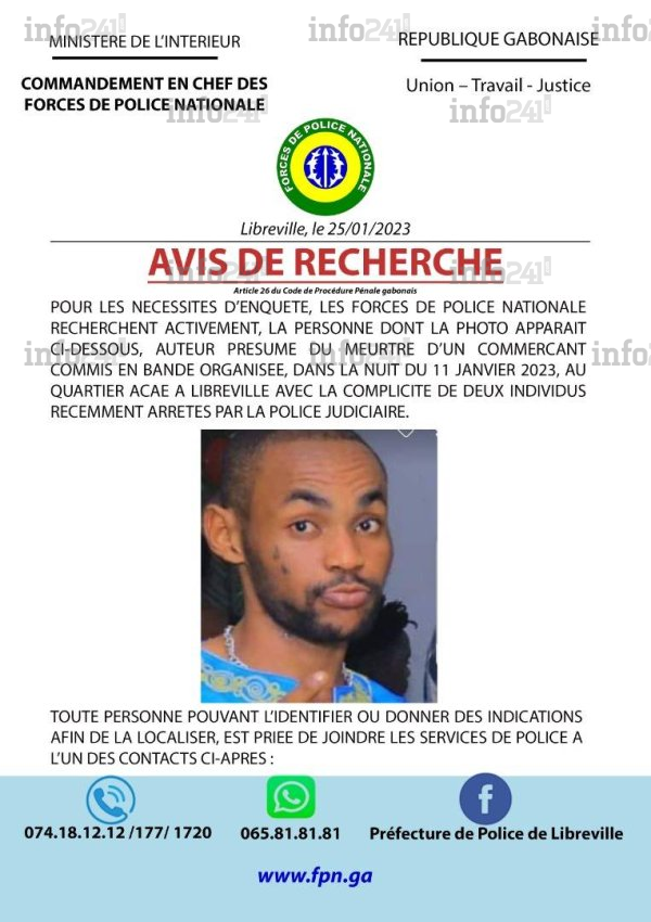 Dans son avis de recherche, la police précise : « Pour les nécessités d’enquête, les Forces de police nationale recherchent activement la personne dont la photo apparait ci-dessous, auteur présumé du meurtre d’un commerçant, commis en bande organisée dans la nuit du 11 janvier 2023, au quartier Acaé à Libreville, avec la complicité de deux individus récemment arrêtés par la Police Judiciaire ». Ce qui laisse penser que la personne recherchée serait l’auteur principal du meurtre.
