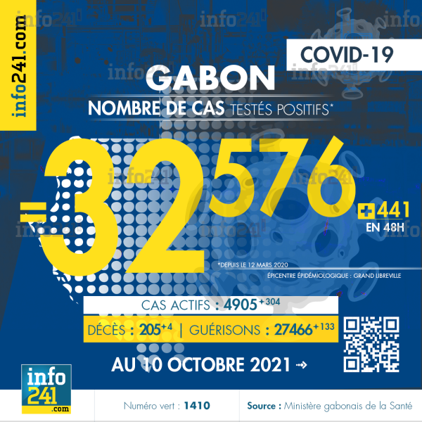 Ce qui porte le bilan à 32 576 cas confirmés, 205 décès et 27 466 guérisons. Le Gabon compte actuellement 4 905 (+304) cas actifs de la pandémie officiellement déclarés. Parmi eux 90 (-10) patients hospitalisés dans le pays dont 21 (-3) en réanimation.