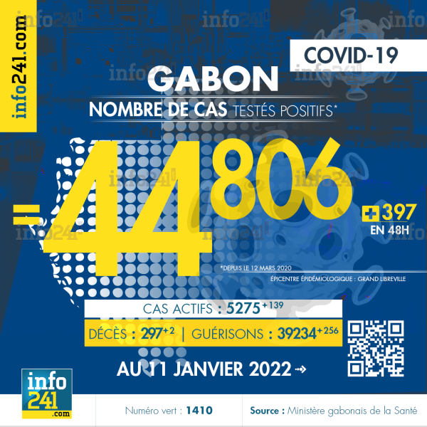 Bilan épidémiologique du Gabon au 11 janvier 2022 : 397 nouveaux cas enregistrés en 48h dans l’Estuaire (334 cas), l’Ogooué-Maritime (30 cas), le Haut-Ogooué (16 cas), le Moyen-Ogooué (7 cas), la Ngounié (4 cas), la Nyanga (3 cas), l’Ogooué-Lolo (2 cas) et l’Ogooué-Ivindo (1 cas). Il y a eu deux nouveaux décès et 256 nouvelles guérisons.