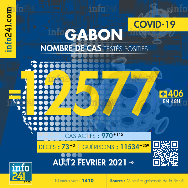 Ce qui porte le bilan à 12 577 cas confirmés, 73 décès et 11 534 guérisons. Le Gabon compte actuellement 970(+145) cas actifs de la pandémie officiellement déclarés. Parmi eux 68(+1) patients hospitalisés dans le pays dont 22(-0) en réanimation.