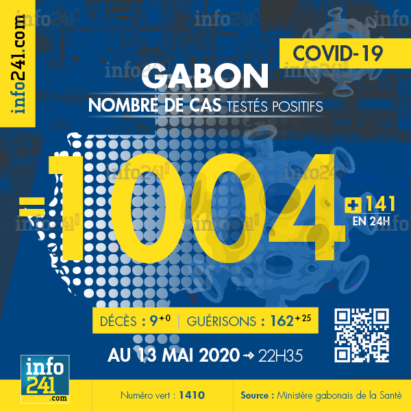 Le bilan de l’épidémie de coronavirus au Gabon au 13 mai : 141 nouveaux cas enregistrés en 24h à Libreville (101 cas), Franceville (36 cas) et Lambaréné (4 cas). Il n’y a aucun nouveau décès et 25 nouvelles guérisons. Ce qui porte le bilan à 1004 cas confirmés, 9 décès et 162 guérisons.