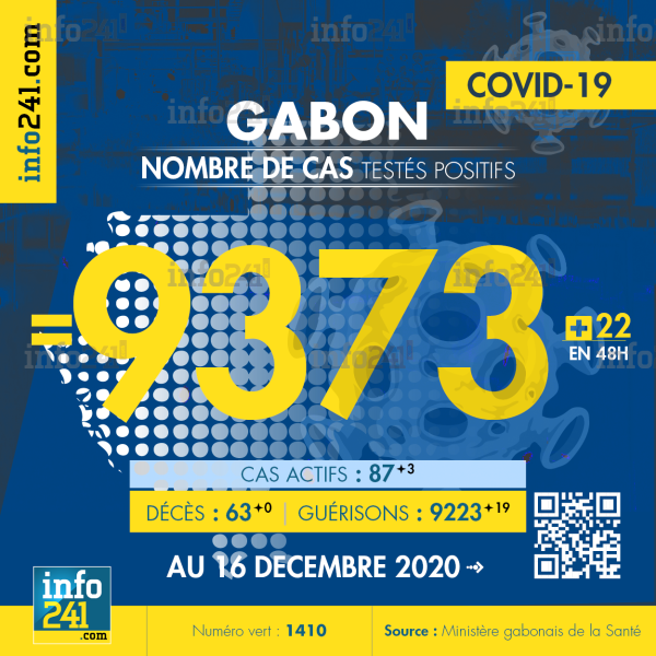 Ce qui porte le bilan à 9 373 cas confirmés, 63 décès et 9 223 guérisons. Le Gabon compte actuellement 87(+3) cas actifs de la pandémie officiellement déclarés. Parmi eux 5(-3) patients hospitalisés dans le pays dont 3(-2) en réanimation.