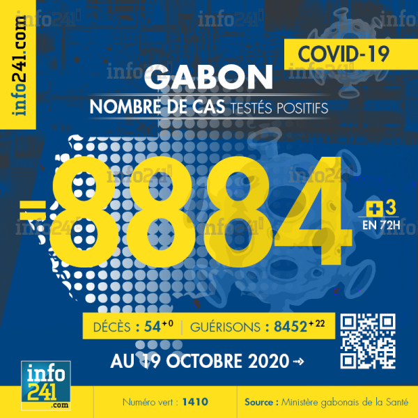 Ce qui porte le bilan à 8 884 cas confirmés, 54 décès et 8 452 guérisons. Le Gabon compte actuellement 397(-19) cas actifs de la pandémie officiellement déclarés. Parmi eux 6(+3) patients hospitalisés dans le pays dont 2(-0) en réanimation.