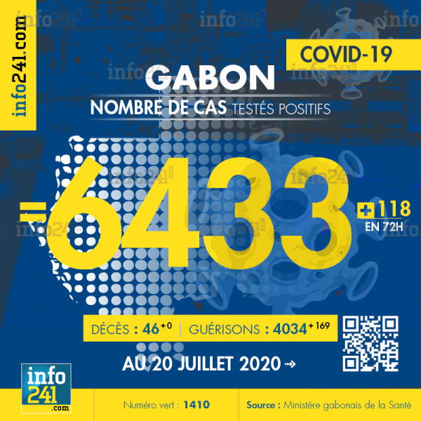 bilan épidémiologique du Gabon au 20 juillet 2020 : 118 nouveaux cas enregistrés en 72h dans l’Estuaire (71 cas), le Haut-Ogooué, l’Ogooué-Maritime et le Woleu-Ntem (1 cas). Il y a eu aucun nouveau décès et 169 nouvelles guérisons.
