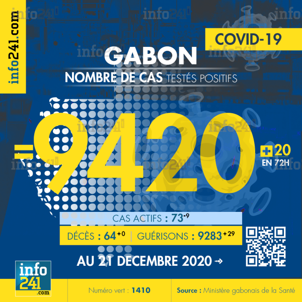 Bilan épidémiologique du Gabon au 21 décembre 2020 : 20 nouveaux cas enregistrés en 72h dans l’Estuaire (16 cas) et l’Ogooué-Maritime (4 cas). Il y a eu aucun nouveau décès et 29 nouvelles guérisons.