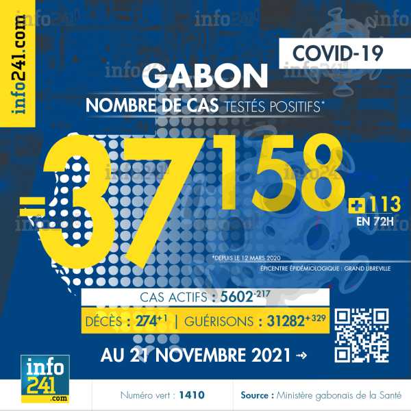 Bilan épidémiologique du Gabon au 21 novembre 2021 : 113 nouveaux cas enregistrés en 72h dans l’Estuaire (57 cas), le Moyen-Ogooué (29 cas), l’Ogooué-Maritime (17 cas), le Haut-Ogooué (7 cas), l’Ogooué-Ivindo (2 cas) et la Nyanga (1 cas). Il y a eu 1 nouveau décès et 329 nouvelles guérisons.