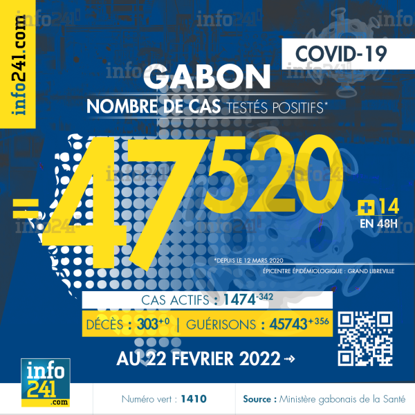 bilan épidémiologique du Gabon au 22 février 2022 : 14 nouveaux cas enregistrés en 48h dans l’Estuaire (11 cas), l’Ogooué-Maritime (2 cas) et le Woleu-Ntem (1 cas). Il y a eu aucun nouveau décès et 356 nouvelles guérisons.