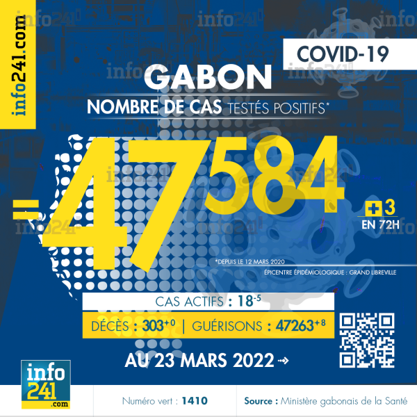 Bilan épidémiologique du Gabon au 23 mars 2022 : 3 nouveaux cas enregistrés en 72h dans l’Ogooué-Maritime. Il y a eu aucun nouveau décès et 8 nouvelles guérisons.