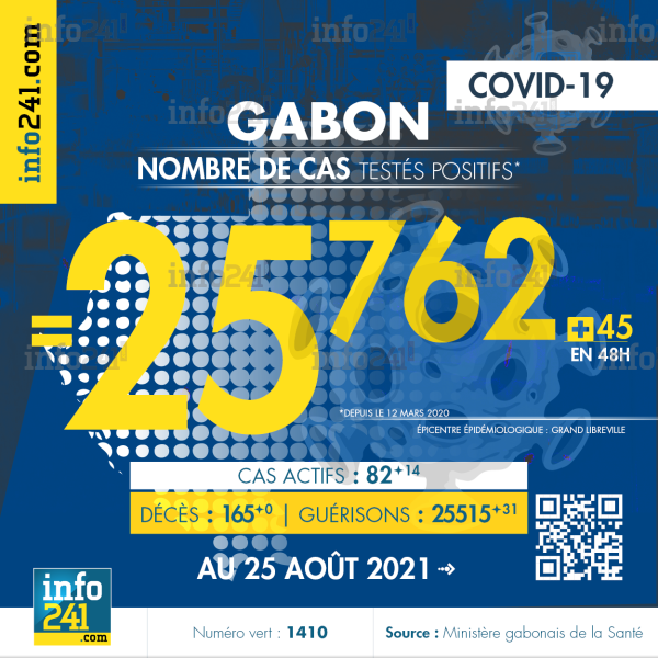 Ce qui porte le bilan à 25 762 cas confirmés, 165 décès et 25 515 guérisons. Le Gabon compte actuellement 82 (+14) cas actifs de la pandémie officiellement déclarés. Parmi eux 12 (+2) patients hospitalisés dans le pays dont 6 (+1) en réanimation.