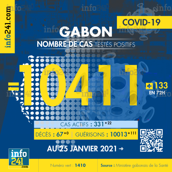 Ce qui porte le bilan à 10 411 cas confirmés, 67 décès et 10 013 guérisons. Le Gabon compte actuellement 331(+22) cas actifs de la pandémie officiellement déclarés. Parmi eux 28(-1) patients hospitalisés dans le pays dont 8(-2) en réanimation.