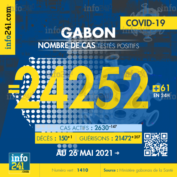 Bilan épidémiologique du Gabon au 26 mai 2021 : 61 nouveaux cas enregistrés en 24h dans l’Estuaire (33 cas), l’Ogooué-Maritime (18 cas), le Moyen-Ogooué (8 cas), la Ngounié (1 cas) et le Haut-Ogooué (1 cas). Il y a eu un nouveau décès et 207 nouvelles guérisons.