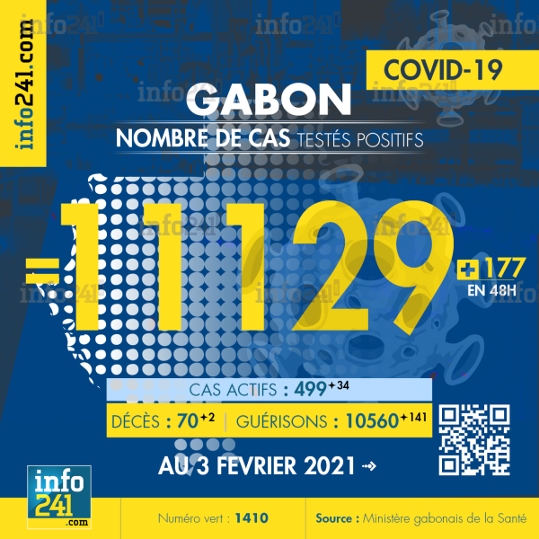 Ce qui porte le bilan à 11 129 cas confirmés, 70 décès et 10 560 guérisons. Le Gabon compte actuellement 499(+34) cas actifs de la pandémie officiellement déclarés. Parmi eux 33(-4) patients hospitalisés dans le pays dont 11(-1) en réanimation.