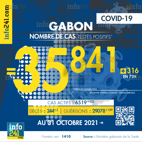 Bilan épidémiologique du Gabon au 31 octobre 2021 : 316 nouveaux cas enregistrés en 72h dans l’Estuaire (246 cas), l’Ogooué-Maritime (40 cas), le Haut-Ogooué (16 cas), la Ngounié (5 cas), l’Ogooué-ivindo (4 cas), l’Ogooué-Lolo (4 cas) et le Woleu-Ntem (1 cas). Il y a eu 5 nouveaux décès et 189 nouvelles guérisons.