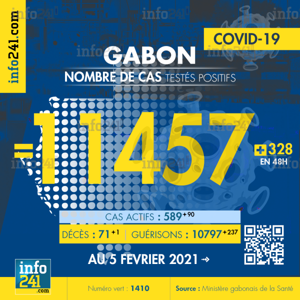 Ce qui porte le bilan à 11 457 cas confirmés, 71 décès et 10 797 guérisons. Le Gabon compte actuellement 589(+90) cas actifs de la pandémie officiellement déclarés. Parmi eux 52(+19) patients hospitalisés dans le pays dont 21(+10) en réanimation.