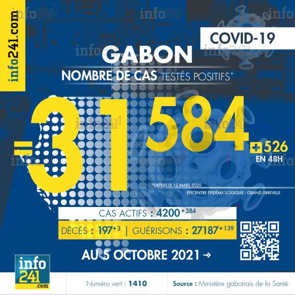Bilan épidémiologique du Gabon au 5 octobre 2021 : 526 nouveaux cas enregistrés en 48h dans l’Estuaire (364 cas), le Haut-Ogooué (113 cas), l’Ogooué-Maritime (24 cas), l’Ogooué-Lolo (14 cas), le Moyen-Ogooué (6 cas), la Nyanga (2 cas) et l’Ogooué-Ivindo (1 cas). Il y a eu 3 nouveaux décès et 139 nouvelles guérisons.