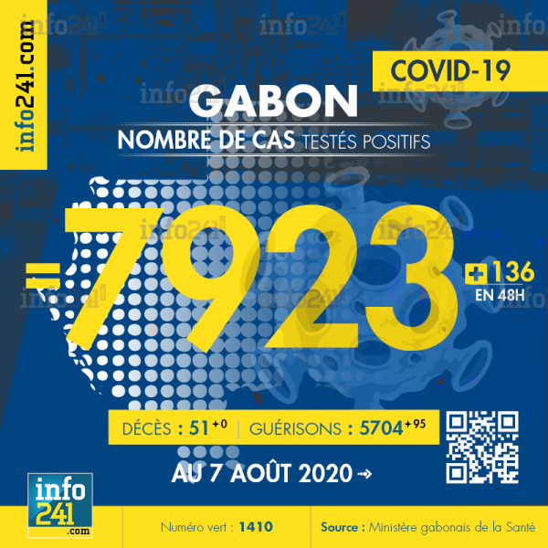Ce qui porte le bilan à 7 923 cas confirmés, 51 décès et 5 704 guérisons. Le Gabon compte actuellement 2 168 cas actifs de la pandémie officiellement déclarés. Parmi eux 45(+18) patients hospitalisés dans le pays dont 9(+5) en réanimation.