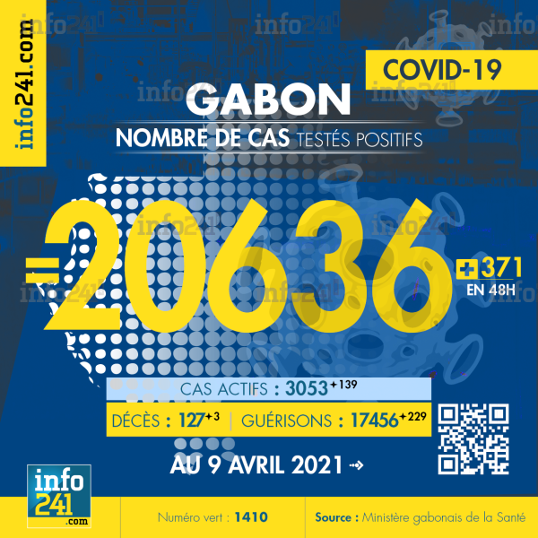 Bilan épidémiologique du Gabon au 9 avril 2021 : 371 nouveaux cas enregistrés en 48h dans l’Estuaire (243 cas), le Moyen-Ogooué (56 cas), l’Ogooué-Lolo (23 cas), le Haut-Ogooué (21 cas), l’Ogooué-Maritime (21 cas), le Woleu-Ntem (4 cas) et l’Ogooué-Ivindo (3 cas). Il y a eu 3 nouveaux décès et 229 nouvelles guérisons.