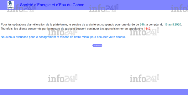 Malgré la fermeture temporaire de la plateforme, la SEEG indique « les clients concernés par la mesure de gratuité peuvent continuer à s’approvisionner en appelant le 1442 ». A l’ancienne donc ! Il faut dire que depuis son lancement, la plateforme visiblement pas au point, méritait de profondes améliorations. Depuis mardi, l’accès était limité à 500 personnes en même temps, puis à 1000, 1500 etc. Il fallait être chanceux pour y avoir accès.
