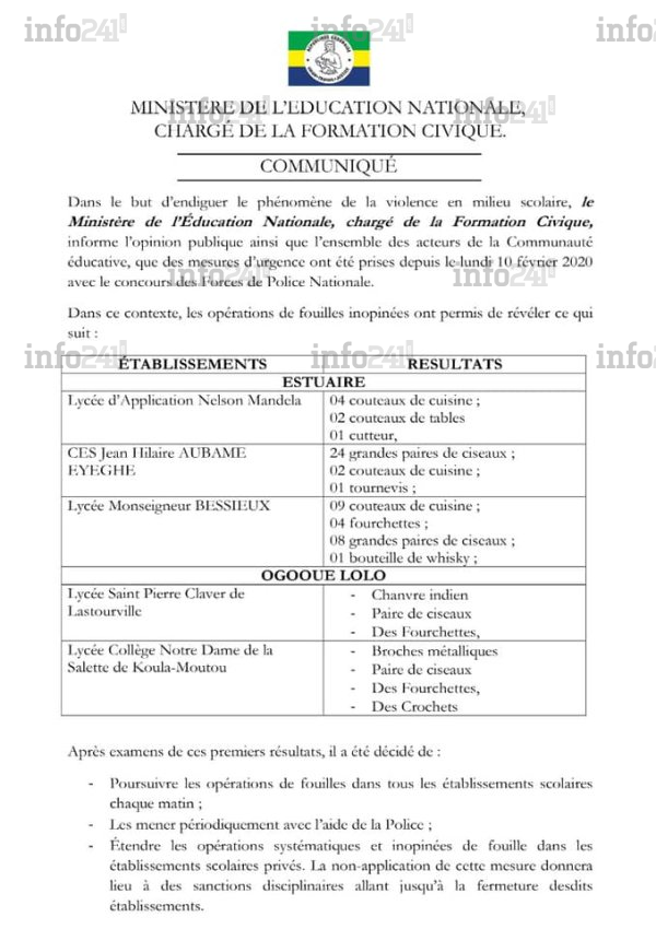 Ces fouilles inopinées ont concerné dans l’Estuaire plusieurs établissements secondaires de Libreville : le lycée d’application Nelson Mandela, le CES Jean Hilaire Obame Eyeghe et le lycée Monseigneur Bessieux. Dans l’Ogooué-Lolo : le lycée Saint Pierre Claver (Lastourville) et le lycée-collège Notre Dame de la Salette (Koulamoutou). A l’issue de ces fouilles, les autorités ont décidé de la poursuite de ces fouilles et de leur extension aux établissements privés.
