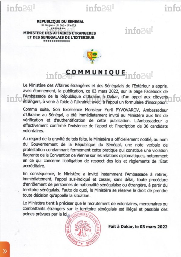 Guerre russe en Ukraine : le Sénégal s’oppose au recrutement de ses citoyens par l’Ukraine © 2022 D.R./Info241