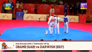 Le combat du Gabonais Anthony OBAME contre l’Egyptien Abdelrahman DARWISH en 1/4 de finales des +87 kg de taekwondo.