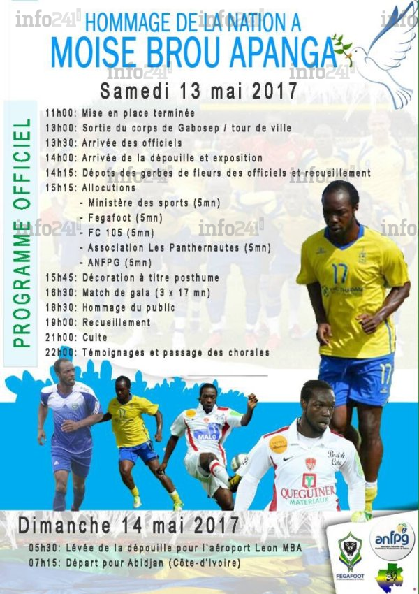 L’international gabonais Moïse Brou Apanga, décédé d’une crise cardiaque mercredi 26 avril à Libreville sur un terrain de football recevra un hommage national demain samedi 13 mai au stade de Nzeng-Ayong. Selon un communiqué de presse de l’Association Nationale des Footballeurs Professionnels du Gabon (ANFPG) parvenu ce vendredi à la rédaction d’Info241, cette cérémonie sera digne de ce que le défunt Brou a apporté à la sélection nationale, Les panthères du Gabon et se fera en présence de tous les dirigeants et instances du footbal gabonais.