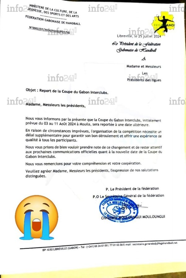 Nouveau coup dur pour handball gabonais. Après avoir déjà essuyé cette année le report des championnats nationaux cadet et junior, le handball gabonais subit un nouveau revers. La Fédération gabonaise de handball (Fegahand) a annoncé le report de la Coupe du Gabon Interclubs, initialement prévue du 3 au 11 août 2024 à Mouila (Ngounié, sud du Gabon). Cette décision, communiquée par un courrier officiel daté du 25 juillet 2024 et adressé aux responsables des ligues, constitue une nouvelle douche froide pour les amateurs de handball, qui se réjouissaient déjà du retour de cette compétition absente des radars depuis six ans.