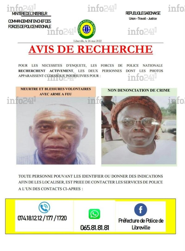 La Préfecture de police de Libreville a lancé ce jeudi, un appel à la population pour l’aider à mettre hors d’état de nuire deux individus recherchés pour meurtre et blessures volontaires avec arme à feu. Il s’agirait d’un homme, la soixantaine d’années révolue et d’une femme qui elle, est poursuivie pour non dénonciation de crime.