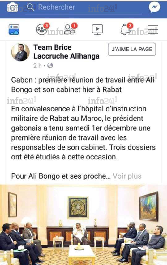Tout est partie d’un post publié hier sur Facebook annonçant une « première réunion de travail entre Ali Bongo et son cabinet » qui aurait eu lieu samedi à l’hôpital militaire de Rabat où Ali Bongo est interné depuis le 27 novembre. Seulement, la photo pour illustrer cette « réunion » est une photo d’archives prise à Libreville en juin 2018. Une supercherie rapidement mise à nu par les internautes qui a obligé l’équipe de Brice Laccruche Alihanga à retirer le post élogieux, censé rassurer les plus sceptiques sur la bonne santé du président.