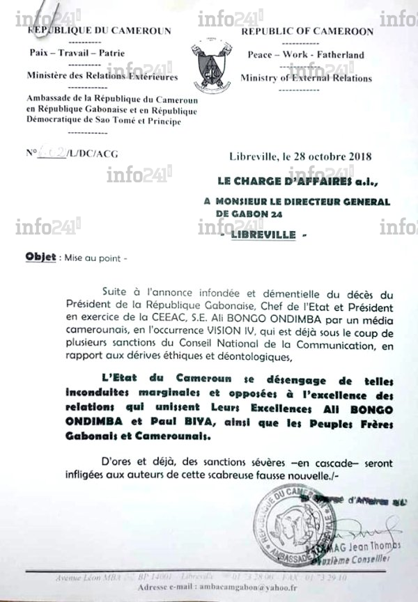Dans la lettre que s’est procuré Info241, Jean Thomas Bacamag dénonce d’entrée une « annonce infondée et démentielle » de nos confrères. Presque pour s’en dédouaner, le diplomate camerounais en poste à Libreville rappelle que : « Vision 4 (..) est déjà sous le coup de plusieurs sanctions du Conseil national de la communication en rapport aux dérives éthiques et déontologiques ».