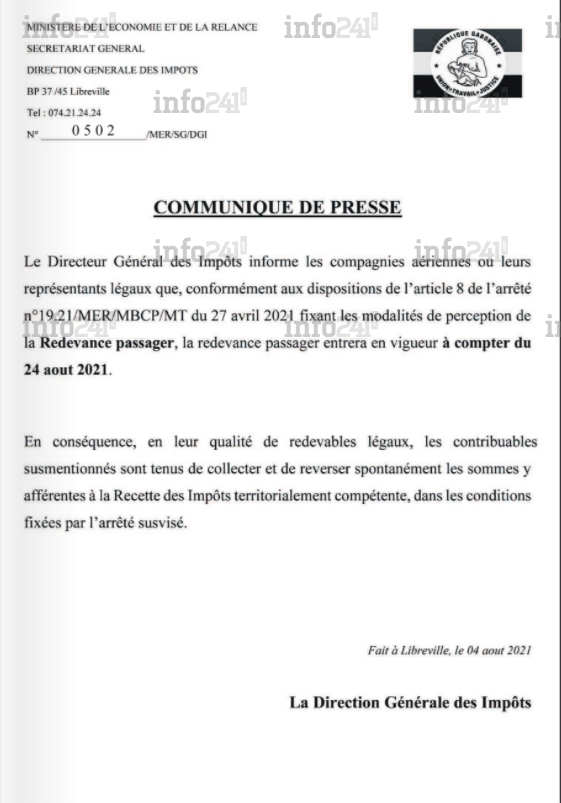 « En leur qualité de redevables légaux, les contribuables susmentionnés sont tenus de collecter et de reverser spontanément les sommes y afférentes à la recette des Impôts territorialement compétente, dans les conditions fixées par l’arrêté susvisé », martèle le communiqué aux responsables aériens. De quoi créer une nouvelle flambée des prix de billets de la destination Gabon, déjà victime de spéculation liée à la pandémie de coronavirus.
