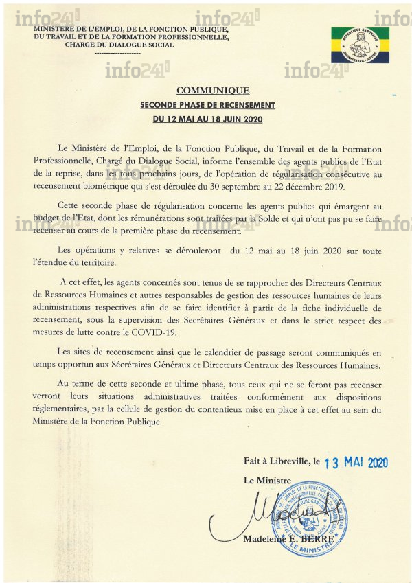 Longtemps repoussée en raison de la crise de coronavirus, la seconde phase de recensement des agents de l’Etat gabonais se poursuit depuis ce 12 mai. C’est ce que martèle un communiqué du ministère de la Fonction Publique parvenu ce jeudi à la rédaction d’Info241. Malgré l’explosion du nombre de cas positif au Covid-19 dans le pays, les autorités ont ainsi décidé de poursuivre leur chasse au fonctionnaire fantôme, bien que le terme ne soit pas directement employé. 11 638 fonctionnaires et agents publics seraient concernés par cette phase.