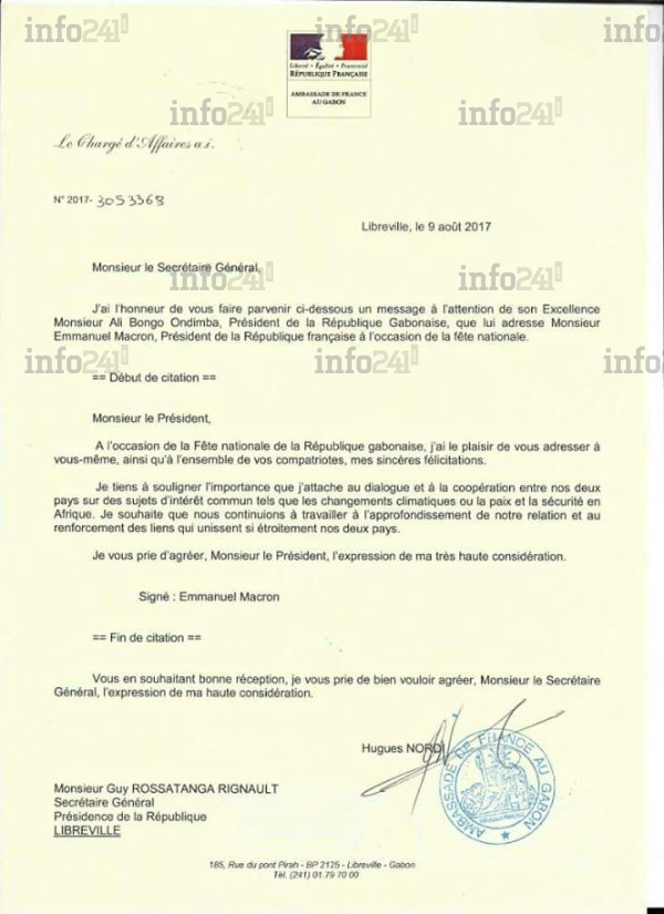 En effet, Emanuel Macron par l’entremise de son ambassadeur a adressé le message suivant : « A l’ occasion de la Fête nationale de la République gabonaise, j’ai le plaisir de vous adresser à vous-même, ainsi qu’à l’ensemble de vos compatriotes, mes sincères félicitations. Je tiens à souligner l’importance que j’attache au dialogue et à la coopération entre nos deux pays sur des sujets d’intérêt commun tels que les changements climatiques ou la paix et la sécurité en Afrique. Je souhaite que nous continuions à travailler à l’approfondissement de notre relation et au renforcement des liens qui unissent si étroitement nos deux pays. Je vous prie d’agréer, Monsieur le Président, l’expression de ma très haute considération ». Cet usage répond à la pratique diplomatique traditionnelle. Pas de quoi y voir une consécration ou des félicitations assumées à l’élection controversée amplifiés d’une tricherie grossière et des violations des droits humains perpétrées par Ali Bongo et son régime. Comme on a pu le lire dans les colonnes de certains médias proches du régime despotique de Libreville, relayé sur les réseaux sociaux par leurs avatars et soutiens.