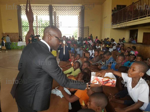 Le ministre-bienfaiteur posant avec des élèves de localité de Mouila