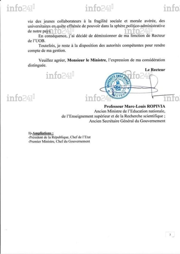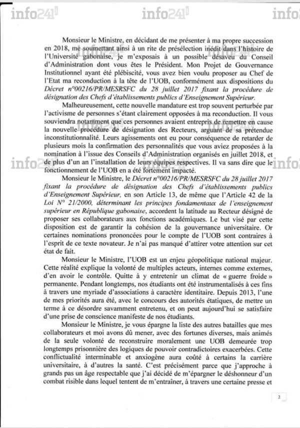 Dans celui-ci adressé au ministre de l’Enseignement supérieur, le recteur démissionnaire a précisé les raisons de son départ : « C’est précisément parce que j’approche à grands pas un âge respectable que j’ai décidé de m’épargner le déshonneur d’un combat risible dans lequel tentent de m’entraîner, à travers une certaine presse via des jeunes collaborateurs à la fragilité sociale et morale avérée, des universitaires en quête effrénée de pouvoir dans la sphère politico-administrative de notre pays (que) j’ai décidé de démissionner de ma fonction de Recteur de I’UOB ».