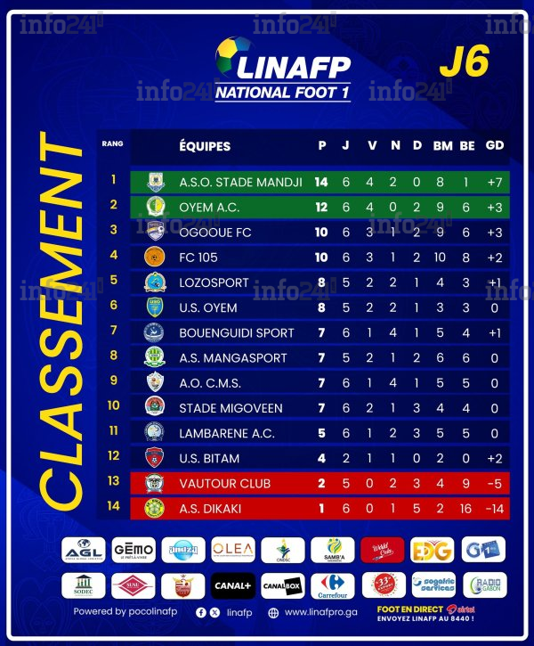 Ce coup d’arrêt pour l’ASO Stade Mandji ralentit légèrement sa course en tête. Le club port-gentillais n’engrange qu’une seule unité pour porter son total à 14 points, voyant ses poursuivants immédiats réduire l’écart. De son côté, l’AS Bouenguidi-Sport profite de ce point arraché au leader pour grappiller une place et se positionner au 7e rang avec 7 points.