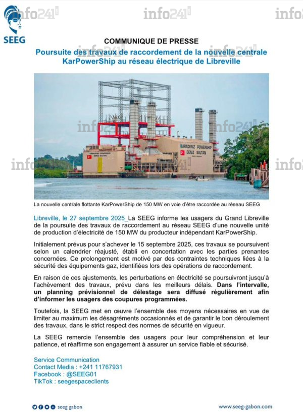 Le communiqué de presse de la Société d’énergie et d’eau du Gabon (SEEG), publié ce samedi soir, a confirmé ce que beaucoup craignaient déjà : le Grand Libreville va connaître de nouveaux délestages en série. L’entreprise publique a annoncé la poursuite des travaux de raccordement de la centrale flottante KarPowerShip de 150 MW au réseau électrique, un chantier initialement prévu pour s’achever le 15 septembre mais désormais prolongé à une date indéterminée.
