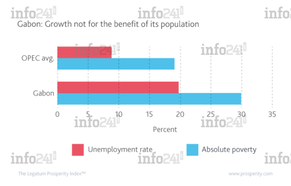 Comparativement à ses pairs de l’OPEP, la croissance du PIB du Gabon de ces 5 dernières années est parmi les plus élevées. Cependant cette belle performance ne se traduit sur la prospérité du pays comme le révèlent les taux relativement élevés de chômage et de pauvreté. Il est tout aussi intéressant de remarquer que le Gabon a le plus haut niveau de l’enseignement supérieur par travailleur de toute l’Afrique sub-saharienne, ainsi que des niveaux élevés de l’enseignement secondaire, mais à cause du manque d’emplois, les populations ont toujours du mal à joindre les deux bouts. Ce décalage entre la main-d’œuvre qualifiée et les besoins économiques constitue l’un des principaux frein à la prospérité du Gabon.