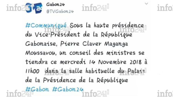 C’est tout d’abord Gabon24, la chaîne d’info en continu du groupe Gabon Télévisions qui l’a annoncé hier sur son compte twitter avant de le retirer. Repris ensuite au journal de 20h de la principale chaîne de télévision publique gabonaise, Gabon télévision, l’information ne faisait pourtant plus aucun doute : "Sous la haute présidence du Vice-Président de la République Gabonaise Pierre Claver Maganga Moussavou, un conseil des ministres se tiendra ce mercredi 14 Novembre 2018 à 11h00 dans la salle habituelle du Palais de la Présidence de la République".